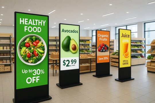 Digital signage bisa membantu berbagai supermarket dalam menangani pelayanan publik. Digital signage mempunyai tujuan sebagai papan interaktif yang bisa digunakan dalam berbagai macam aktivitas. Perangkat ini bisa menampilkan video dan gambar yang memberikan informasi berguna tentang direktori yang tersedia di supermarket. Perangkat ini juga bisa menampilkan promosi produk atau diskon yang bisa menarik perhatian pelanggan untuk bisa mendapatkan produk tersebut.